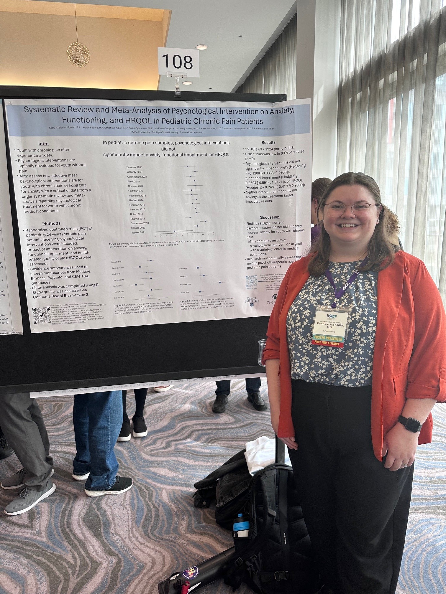 Bieniak-Fortier, K. H., Bedree, H., Adler, M., Ogunmona, S., Kovar-Gough, I., Ma, W., Thabrew, H., Cunningham, N., & Tran, S. T. (2025, April 29-May 2). Systematic review and meta-analysis of psychological intervention on anxiety, functioning, and HRQOL in pediatric chronic pain patients [Poster Presentation]. United States Association for the Study of Pain. Chicago, IL.