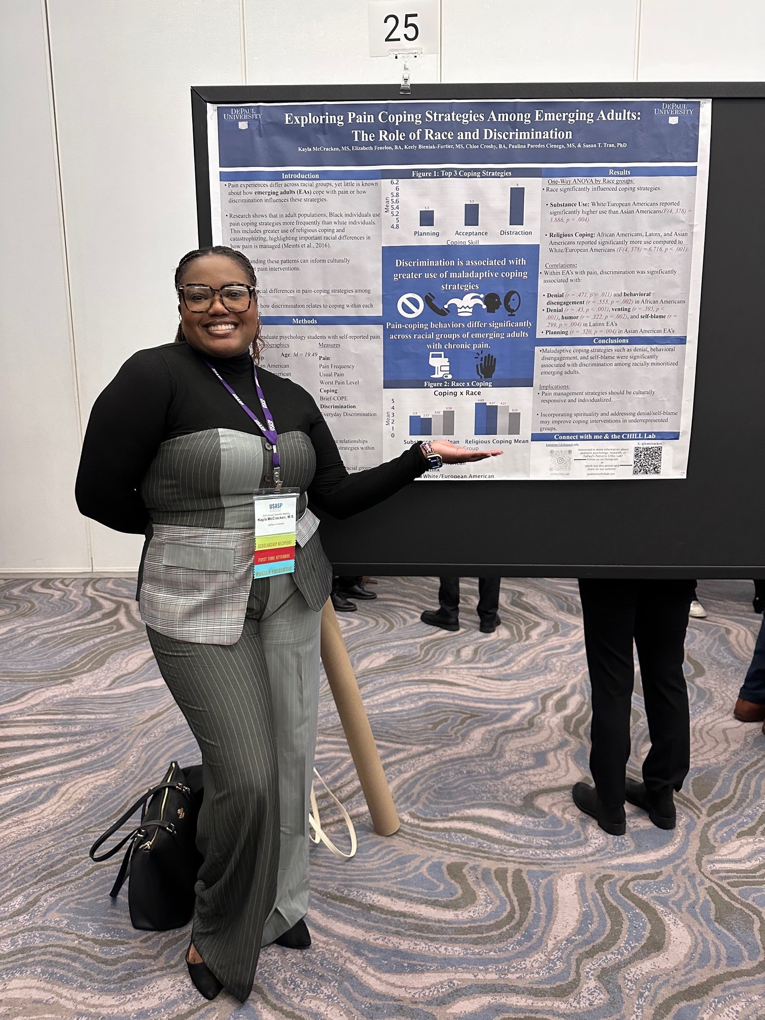 McCracken, K., Fenelon, E., Bieniak, K., Paredes Cienega, P., & Tran, S. T. (2025, April 29-May 2). Exploring pain coping strategies among emerging adults: The role of race and discrimination [Poster Presentation]. United States Association for the Study of Pain Annual Convention, Chicago, IL.
